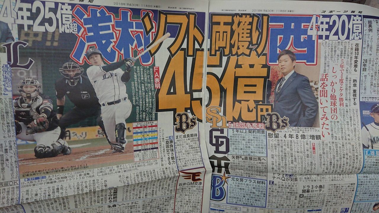 国内FA権行使を受け、ソフトバンクが参戦を表明。浅村には4年総額28億円、