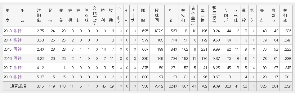 藤浪晋太郎(22) 7勝11敗 防御率3.25 与四球率3.73 奪三振率9.37