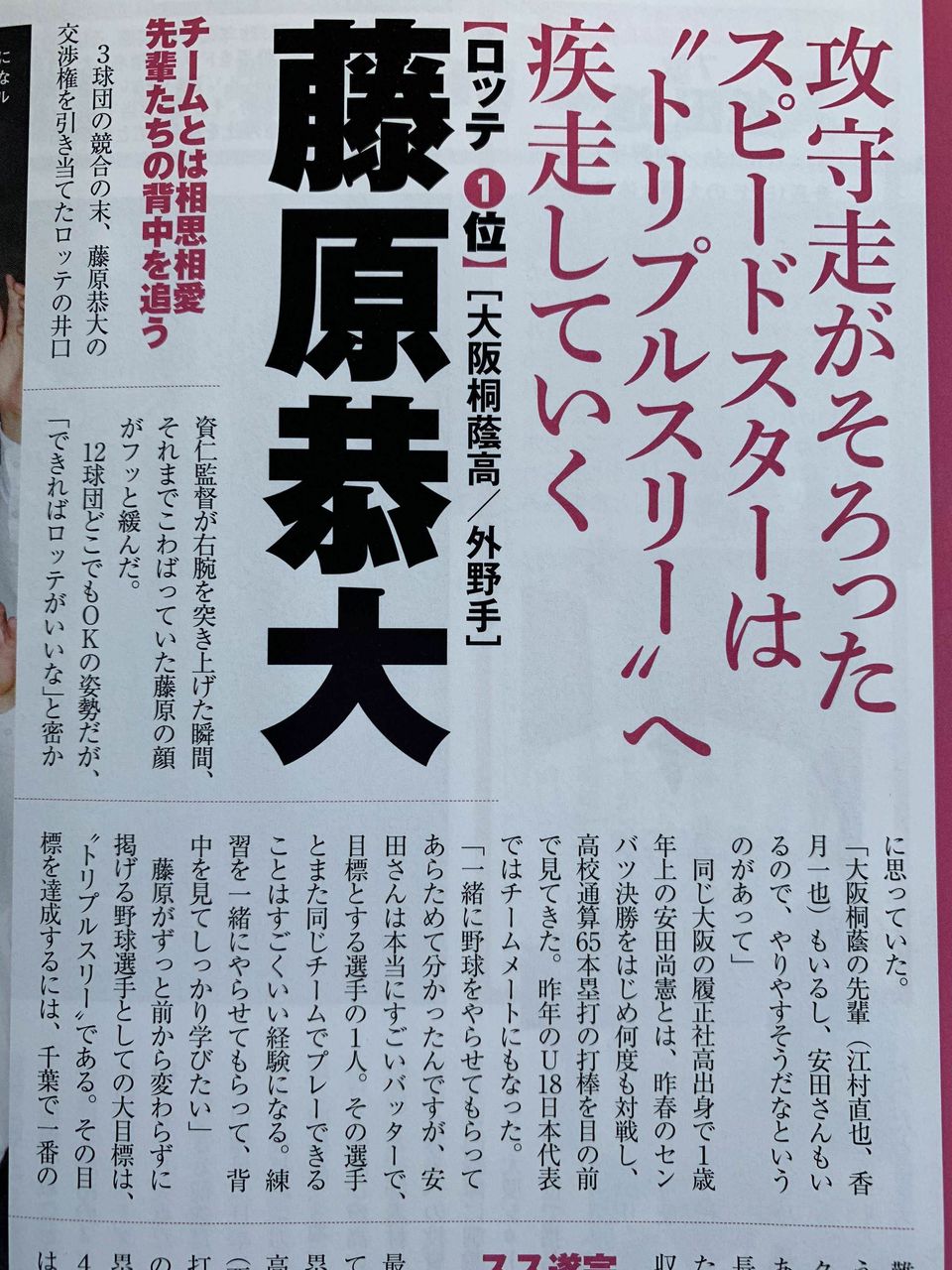 > ドラフト1位の藤原恭大外野手は「最大の持ち味は足。幕張のスピードスターと呼ばれるようになりたい」と語った。